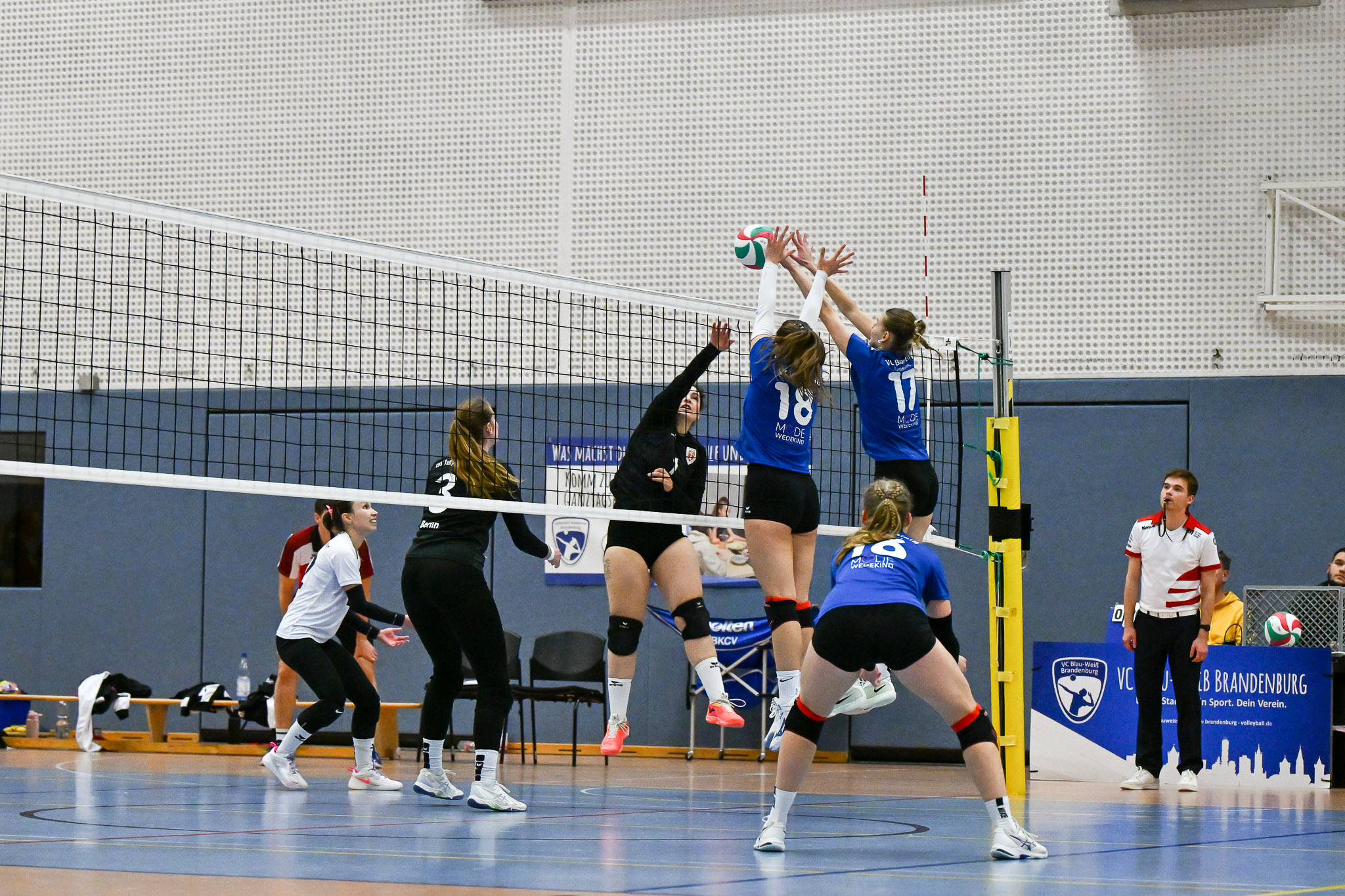 Das anstrengende Doppelspiel-Wochenende brachte für die Volleyballerinnen des VC Blau-Weiß fünf der sechs zu vergebenen Tabellenpunkte ein. Was erst mal gut klingt, ist rückblickend dann doch einer zu wenig. Vor allem das Spitzenspiel am Sonnabend vor heimischer Kulisse gegen den ungeschlagenen TSV Tempelhof Mariendorf hielt, was es im Vorfeld versprach. Einen kleinen Schockmoment erlebte der VCB jedoch bereits kurz vor dem Spiel. Bei der Erwärmung verletzte sich Kapitänin Adina Künstler am Knie und konnte nicht eingesetzt werden. Großen Einfluss hatte dies zunächst nicht, denn ohne Kompromisse und bis in die Haarspitzen motiviert zeigten sich die Schützlinge von Trainer Sebastian Pfeiffer zu Beginn. Mit einem beeindruckenden 25:9-Erfolg im ersten Satz mussten sich nicht nur die Zuschauer die Augen reiben. Komplett fokussiert gingen die Brandenburgerinnen hier zu Werke und setzten den Gegnerinnen mit druckvollen Aufschlägen und Angriffen merklich zu. Dass es in dieser Form nicht über die gesamte Spielzeit ging, war zu erwarten. Ab dem zweiten Durchgang wurde das Spiel dann deutlich ausgeglichener. Mit 21:25 und 25:23 verzeichneten dann beide Teams je einen Satzgewinn, was dem VC Blau-Weiß eine gute Ausgangsposition bescherte. Bitter wurde es dann aber im vierten Satz. Mit 19:11 in Führung sprach eigentlich alles für einen 3:1- Sieg der Brandenburgerinnen. Doch Stück für Stück verkürzten die Gegnerinnen den Abstand und konnten am Ende doch zum 2:2 nach Sätzen ausgleichen. Der abschließende Entscheidungssatz war dann wieder geprägt von einer klaren Dominanz der Blau-Weißen. Getragen vom heimischen Publikum gab es wie im Eröffnungsdurchgang nochmal ein kleines spielerisches Schaulaufen. Mit einem deutlichen 15:5- Satzgewinn gab es letztlich keinen Zweifel mehr über den verdienten 3:2- Sieg des VC Blau-Weiß.